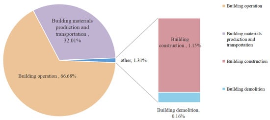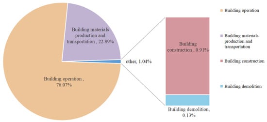 By analyzing the carbon emissions throughout the entire life cycle of buildings, the proportion of carbon emissions during the production and transportation stages of building materials is 22.89%, 0.91% during the construction stage, 76.07% during the operational stage, and 0.13% during the demolition stage. Among them, the proportion of carbon emissions during the operational stage is the highest, and compared with some previous studies on the proportion of carbon emissions during the operation stage [16,47], the results are similar to the results of this study in terms of the emission ratio during the operation stage (78.0–85.4%). According to the results, public buildings have the greatest potential for carbon reduction during the operation stage.