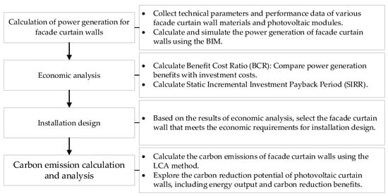 As demonstrated in Section 3.2, the operational stage contributes the highest percentage of carbon emissions throughout the entire life cycle. Thus, controlling carbon dioxide emissions during this stage is the most direct and effective approach to reduce overall carbon emissions of buildings. In this section, the case building will incorporate photovoltaic curtain walls, replacing the existing glass curtain wall, in order to systematically analyze and compare the impact of photovoltaic curtain walls on the carbon emissions of the entire building life cycle. The objective is to minimize carbon emissions to the greatest extent possible. A summary of the steps involved in the entire analysis process is presented in the form of a flowchart to assist design and construction managers in understanding the overall methodology. The analysis process of carbon emission reduction is shown in Figure 5.