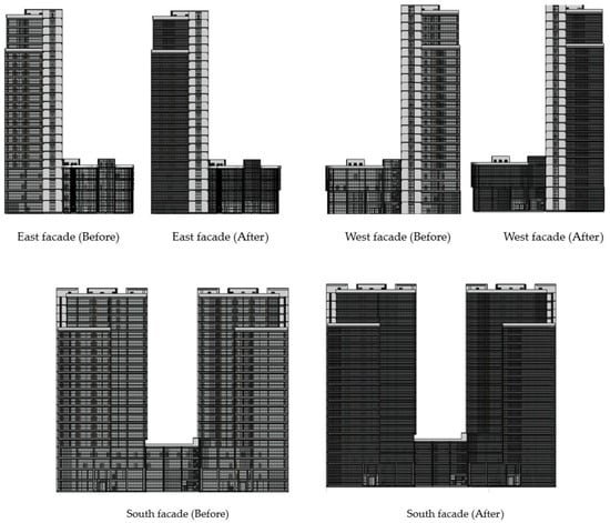 This study replaces the glass curtain walls on the east, west, and south facades of the original building with photovoltaic curtain walls. The comparative analysis chart showcasing the before and after replacement of the curtain wall is illustrated in Figure 6. Throughout the entire life cycle of a building, the replacement of photovoltaic curtain walls primarily affects the carbon emissions during the operational stage of the building and the production and transportation stages of building materials. Table 10 provides a comparison of the carbon emissions of building curtain walls during the production and transportation stages of building materials before and after the replacement of curtain walls. The service life of the building is 50 years, of which the service life of the photovoltaic curtain wall is 25 years. Therefore, two carbon emission calculations for the production and transportation stages of the building materials of the photovoltaic curtain wall are required throughout the entire service period.