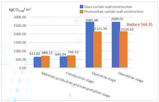 According to the comparison in Figure 9, there is a significant difference in carbon emissions between photovoltaic curtain wall buildings and traditional glass curtain wall buildings. Compared to glass curtain wall buildings, photovoltaic curtain wall buildings reduce carbon emissions by 564.38 kgCO2-eq per square meter of building area. This is mainly due to the fact that photovoltaic curtain walls can provide clean power and achieve carbon reduction during the operation phase of the building.