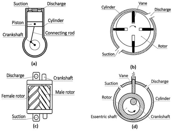 Common mechanisms of positive displacement compressors. (a) Reciprocating piston; (b) vane-type; (c) screw-type; (d) rolling piston type.