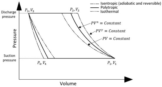 Figure 3 is employed here as an excellent example of positive displacement compressors where the working fluid is admitted into a compression chamber of volume, , through a suction valve with the help of the vacuum created by the machine’s member, which controls the volume, . The moving machine’s member can be, in this case, a reciprocating piston (shown in Figure 3); however, it can also be rotating components in other designs, as depicted in Figure 1.