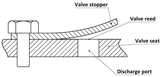 - Yu, X.; Ren, Y.; Tan, Q.; Lu, Z.; Jia, X.; Wang, X. Study on the torsional movement of a reed valve in a rotary compressor. Adv. Mech. Eng. 2018, 10, 1687814018778402. [Google Scholar] [CrossRef]