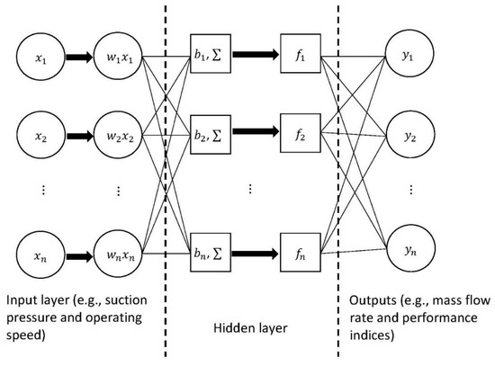 Artificial neural network (ANN) is a method inspired by biological neural networks to solve complex problems in a variety of disciplines [104]. A typical structure of ANN has three layers, namely input, hidden (can be multiple), and output layers. In practice, each input data, , is multiplied by a weighting factor, , and then connected to the output via the hidden layer, which contains an added bias, ; the summation function, ; and the activation function, f. Figure 6 depicts the schematic diagram of the ANN workflow.