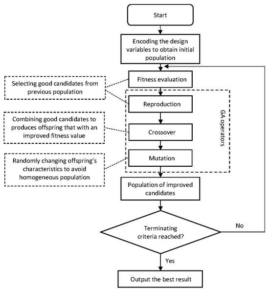 Genetic algorithm (GA) is another machine learning method used in the optimisation of many engineering problems. It is inspired by the principle of natural selection and evolution to find design solutions from a large search space based on fitness/objective values [110]. A classic GA is comprised of five phases, including encoding, fitness/objective evaluation, reproduction, crossover, and mutation. Figure 7 presents a detailed process of GA.