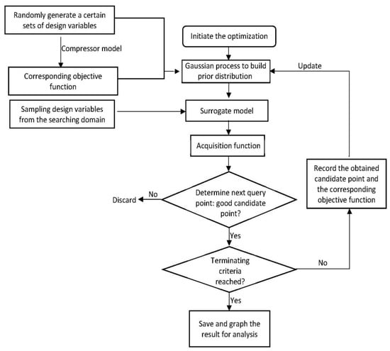 There are some other machine learning methods applied in the modelling and optimisation of positive displacement compressors, albeit to a limited level. Lu et al. [114,115] used the Bayesian optimisation method to optimise the port geometries of the limaçon rotary compressor. According to the results, the authors discovered that most of the obtained outcomes fall within the desired region, and the average isentropic and volumetric efficiencies obtained from the optimisation were 93.81% and 83.62%, respectively. In addition, the authors also reported that the obtained optimum design exhibits a certain level of robustness when the operating condition fluctuated within a small percentage around that used in the optimisation. Figure 8 shows the process of the Bayesian optimisation method applied in positive displacement compressors.
