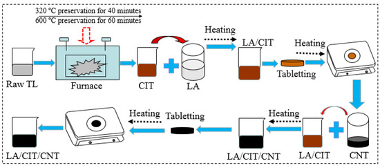 The LA/CIT/CNT FSPCMs were synthesized by simple and facile direct impregnation [1,4,32]. The whole preparation procedure of the LA/CIT/CNT composites is illustrated in Figure 1. Firstly, the ITs were screened into −60 mesh before use, and then mixed with montmorillonite binder additive. Afterward the mixture was calcinated at 300 °C for half an hour in a high-temperature furnace. Then, the mixture was again heated constantly at 600 °C for 2 h. After that, the residual ash was cooled to 20 °C [31,32,33]. Thus CIT can be obtained, and its chemical components are also shown in Table 1. The comparison of chemical components between CIT and IT in Table 1 demonstrated that IT can be employed as a supporting matrix to prevent leakage of LA in theory. Subsequently, the specified amount of LA and CIT were weighed and mixed according to different mass fractions in 250 mL beakers, respectively. The mixture was heated in a water bath, and the temperature of the water bath was maintained at 75 °C for 20 min. Meanwhile, the mixture was continuously stirred using a glass rod by hand. Then, the obtained LA/CIT composites were cooled to room temperature. And the LA/CIT composites were achieved. Secondly, according to the literature [1,32,34], the leakage tests were performed on the magnetic stirrers by using the DOT method at 60 °C, respectively. Like this, the composite without leakage of LA was called FSPCM. Thirdly, CNTs with different mass fractions of 1, 3, 5, and 7% were added into the LA/CIT FSPCM to fabricate the LA/CIT/CNT FSPCM. And the experimental conditions and procedures mentioned above were repeated. Thus, the LA/CIT/CNT FSPCM was obtained.