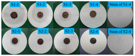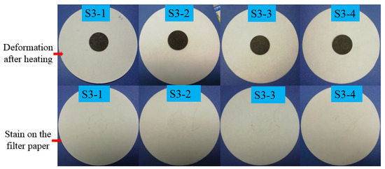 Leakage results and liquid stains on the paper after heating at 60 °C of LA/CIT composites of S3-1, S3-2, S3-3, and S3-4.