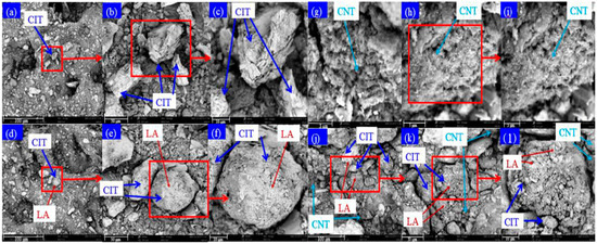 SEM photographs of CIT (a–c), LA/CIT (d–f), CNT (g–i), LA/CIT/CNT (j–l).