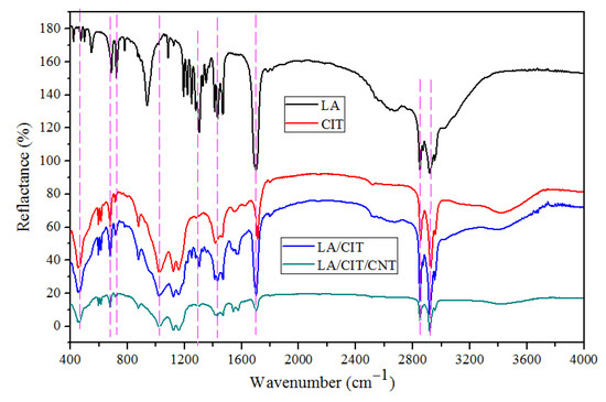 FTIR spectra of LA, TL, CIT, LA/CIT, and LA/CIT/CNT samples.
