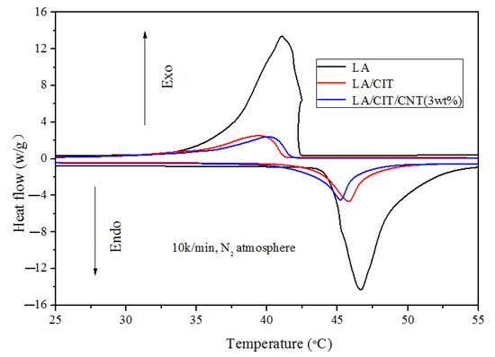 Thermal energy storage performances gained by DSC of LA and the LA/CIT FSPCMs and LA/CIT/CNT FSPCMs are described in Figure 6. The detailed data were listed in Table 3. The phase-change temperatures of LA, LA/CIT FSPCM, and LA/CIT/CNT FSPCM were about 46.46 °C, 45.8 °C, and 45.24 °C during storage and 41.23 °C, 39.39 °C, and 39.61 °C during discharging, respectively. The phase-change temperatures of the fabricated FSPCMs were slightly lower than those of LA (changed slightly) due to the confinement of LA in the micro-pores of CITs. The latent heat values of LA and the LA/CIT FSPCMs and LA/CIT/CNT FSPCMs were about 182.6 J/g, 45.06 J/g, and 39.95 J/g when charging and 181.4 J/g, 38.73 J/g, and 35.63 J/g when discharging, respectively. The latent heat values of the LA/CIT FSPCMs and LA/CIT/CNT FSPCMs were lower than that of pure LA due to the interference of CITs, which affected on the crystal arrangement and the orientation of the molecules chains of LA.