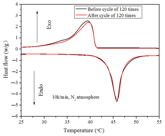 In addition, the thermal reliability of the prepared LA/CIT/CNT FSPCM was evaluated using a cyclic test. And the thermal stability of the LA/CIT/CNT FSPCM samples after 120 thermal cycles was tested by DSC. The performance of the LA/CIT/CNT FSPCM sample before and after heating and cooling cycles is shown in Figure 7. As seen in Figure 7, after 120 thermal cycles, the melting temperature and freezing temperature of the LA/CIT/CNT FSPCMs were increased by 0.1 °C and 0.78 °C, respectively, and the latent heat for the melting process and the freezing process was slightly reduced by 1.78% and 4.63%, respectively. The latent heat of the LA/CIT/CNT FSPCMs was slightly lower after heating and cooling cycles, and the phase-change temperature showed a slight deviation after the repeated heating and cooling cycles. This may be due to the appearance of imperfect crystallites with the addition of CITs or CNTs [46,47]. No degradation was observed during the repeated heating and cooling cycles. This was because the DSC temperature of the measured LA/CIT/CNT FSPCM was about 60 °C, which was lower than the initial degradation temperatures of LA/CIT/CNT FSPCMs. Comparing the DSC results of the LA/CIT/CNT FSPCMs before and after heating and cooling cycles, there was no significant difference in the phase-change temperature and latent heat value during the melting and solidifying processes. After 120 thermal cycles, the latent heat of LA/CIT/CNT FSPCM during the melting process can be maintained at a reasonable level. Though they experienced a long life cycle, the LA/CIT/CNT FSPCMs still demonstrated good thermal reliability. The special structure of CITs and CNTs imparted FSPCMs with good thermal reliability reflected by a slight variation in latent heat.