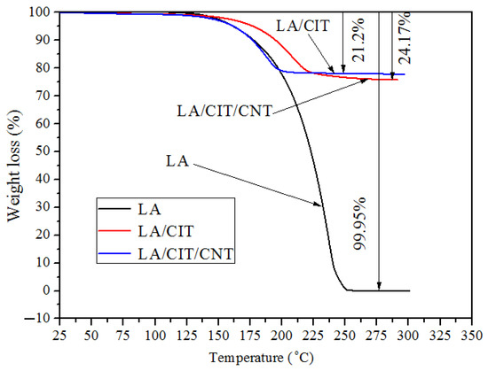 TGA cures of LA, LA/CIT FSPCMs, and LA/CIT/CNT FSPCMs.