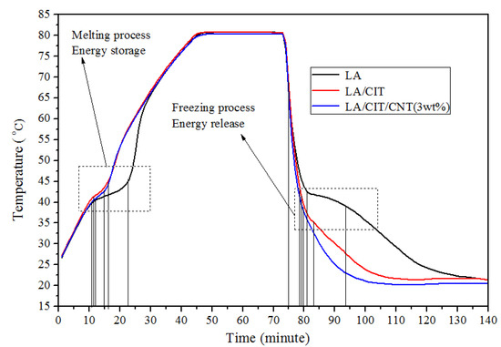 The measured heat storage/release results of the samples were presented in Figure 9 and Table 5 to assess the heat transfer efficiency. As can be seen from Figure 9 and Table 5, it required about 12 min for pure LA to reach the melting point from 25 °C, whereas it required only 11 min and 10.5 min for the LA/CIT FSPCMs and LA/CIT/CNT FSPCMs to reach to their melting point, respectively. In the solidifying process, it required about 6 min for the pure LA to reach the solidification point, whereas it required only 5 min and 3 min for the LA/CIT FSPCMs and LA/CIT/CNT FSPCMs to reach their solidification point from 75 °C, respectively. Moreover, the constant equilibrium temperature time of the LA/CIT/CNT FSPCMs was about 4.5 min during the melting process and 3 min during the solidification process, respectively, while it required 5 min and 5 min for the LA/CIT FSPCMs, and 23 min and 6 min for LA. These fully confirmed that the heat transfer efficiency of the LA/CIT/CNT FSPCMs was enhanced due to the introduction of the CNT additive. In other words, the thermal storage/release rate was significantly improved. The heat transfer efficiency of the LA/CIT/CNT FSPCMs showed obvious advantage over others, which was 84.62% higher than LA and 50% higher than the LA/CIT FSPCMs during the freezing process, respectively. The abovementioned analysis meant that the addition of CNTs can improve the heat transfer efficiency of FSPCMs during heat absorption and release.