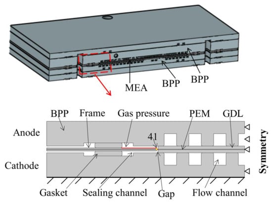 Schematic diagram of PEMFC and the finite element simulation model. The red line represents that a pressure boundary load of 20 kPa was applied to the anode side in the model. Take 41 (yellow dot) at the end of the anode frame of the membrane as the observation point of stress.