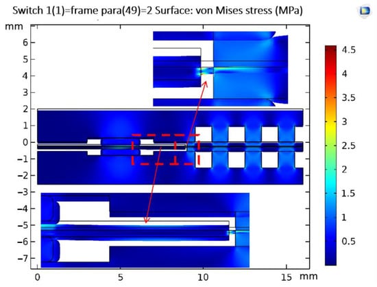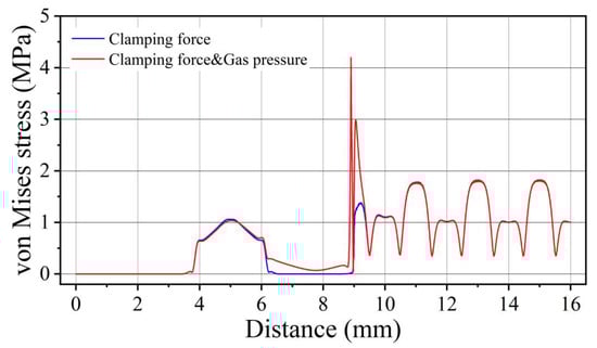 The simulation results showed that under the action of the pressure difference, the frame bends and deforms toward the cathode side close to the cathode bipolar plate. On one side of the active area, the flow channel ridges compressed the MEA to limit further deformation of the frame and membrane. It should be noted that the frame was generally deformed. However, the place closest to the cathode bipolar plate (where the deformation is greatest) is not the end of the active area of the frame, but the middle position between the seal and the end of the active area. This is closer to the active area. The membrane drags the end of the frame to limit its further downward movement and is torn, which increases stress on the membrane. The model von Mises stress cloud diagram under the combined action of clamping force and pressure difference is shown in Figure 2. The stress on the side of the frame close to the active area increases under the action of the pressure difference. Stress on the membrane at the gap between the frame and active area increases significantly and concentrates at the end of the frame. More precisely, as shown in Figure 3 (the gap is between 8.9 and 9 mm), stress concentration appears on the membrane under the frame after the reactant gas is filled to produce a pressure difference and the local stress increases to 4.20 MPa (close to the yield stress of 6.75 MPa under this condition).
