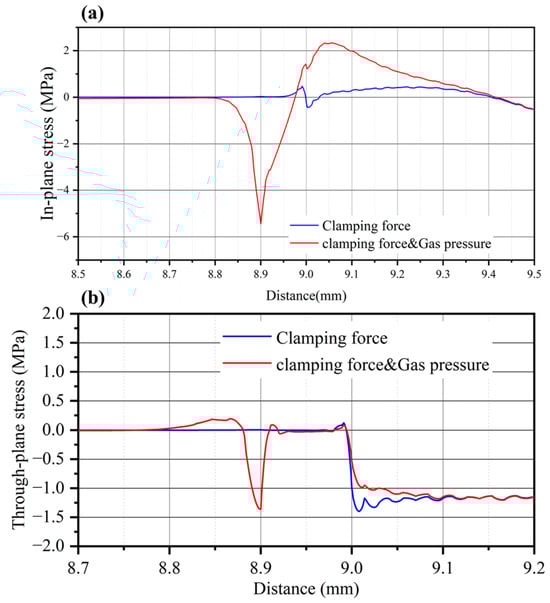 After the pressure was applied, the tension and compression state of the frame and the surface of the membrane in the active area changed. As shown in Figure 4, taking the anode side of the membrane as an example, the membrane at the joint of the frame and active area is in a compressed state after the clamping force is applied and the in-plane stress (stress tensor sl11, along the x direction) has a negative value. This is due to the extrusion deformation of the gasket and where the flow channel lands when the MEA is clamped. After the gas pressure difference was applied, the internal stress increased significantly. The membrane stress at the end of the frame reached −5.44 MPa. At a certain position of gap, the internal stress on the membrane becomes positive, changing from the compressed state to the tensile state. The pressure difference offsets the compression deformation of the membrane during the clamping process and the stress changes alternately. The membrane through-plane stress (stress tensor sl22, along the y direction) also increased at the end of the frame and GDL. In general, the frame deformed after the gas pressure difference was applied to the membrane in the joint area. As a result, the stress on the membrane in the joint area increased significantly and stress concentration occurred at the ends of the frames. Both the in-plane stress and the through-plane stress increased to varying degrees and the in-plane stress played a leading role. The tension and compression state of the membrane changed after gas filling and the alternating stress significantly reduced the fatigue life of the membrane.