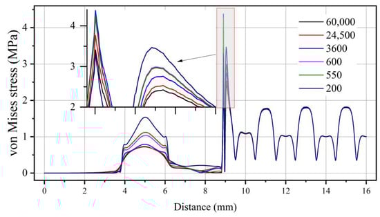 Taking the anode side as an example, the membrane stress distribution after gas filling was as shown in Figure 5. There was a big difference in the stress distribution on the membrane under the gaskets. It was found that the higher the elastic modulus, the smaller the stress on the membrane. Taking the elastic modulus as the material number, the stress on the membrane corresponding to the center of the gasket was 200 (1.53 MPa), 550 (1.12 MPa), 600 (1.04 MPa), 3600 (0.79 MPa), 24,500 (0.73 MPa) and 60,000 (0.72 MPa). Near the end of the frame and GDL, points with greater stress appeared on the membrane.