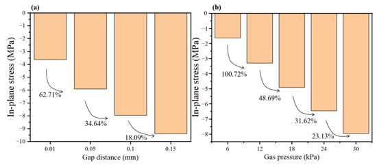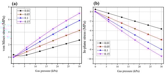 Relationship between the von Mises stress (a) and the in-plane stress (b) at point 41 of different gap widths with the gas pressure.