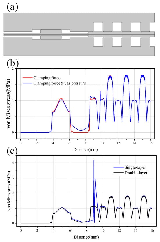 (a) Schematic diagram of double-layer frame structure. (b) Stress distribution on the membrane of the double-layer frame structure. (c) Comparison of the stress distribution on the membrane of the two frame structures under the conditions of clamping force and gas pressure.