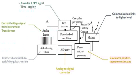 In this context comes the PMU is a device used in power systems to measure electrical quantities with high accuracy based on time synchronization. It provides real-time data on voltage, current, phase angles, and frequency, enabling detailed monitoring and analysis of power system behavior (see Figure 1). It has an accuracy angle of , total vector error allowance of ±0.05% (precision), angle resolution of , and magnitude resolution of ±0.0002%. Its sampling rate is adjustable in the range (of 10–120) samples per second for a 60 Hz system [32,33].