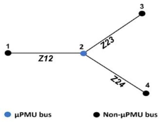 A PMU is only placed on node 2, which is surrounded by nodes 1, 3, and 4, and presents the impedance values of the incident lines at node 2. The PMU will measure the voltage value V2 of node 2 and the current values of the incident lines. Using (1)–(3), the voltage values, and of nodes 1, 2, and 3 could be calculated.
