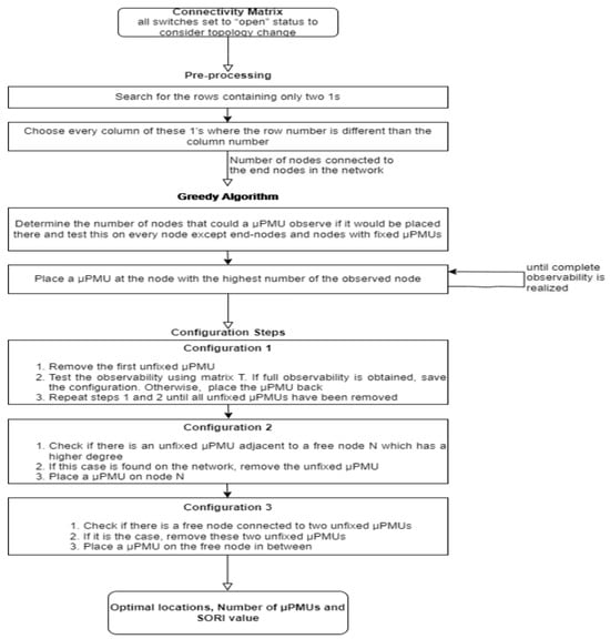 - Functioning of the AlgorithmThe proposed algorithm has the connectivity matrix of the network as input. To consider the topology change of the network, this matrix is built with all switches set to “open” status, which is the worst case.To avoid the manual creation of the connectivity matrix, a user interface is used to draw the graph of the desired network and an algorithm would automatically generate the connectivity matrix into an Excel file. This Excel file will be the input of the algorithm.The algorithm is composed of a pre-processing step and a greedy algorithm followed by three configurations. The result of this algorithm is the placement of the PMUs on the network graph as well as the number of, the SORI values, and the nodes where the PMUs have been optimally placed. The algorithm also detects the location of switches on the network. The block diagram of this algorithm is presented in Figure 3.A greedy algorithm, by nature, focuses on making locally optimal decisions at each step of a problem-solving process without considering the global consequences. While it may not inherently prioritize data quality assurance. Consider adding redundancy to the placement by placing multiple PMUs in critical areas. The greedy algorithm can distribute PMUs strategically to maximize both data quality and redundancy. In each step of the greedy algorithm, select the next µPMU location based on the scoring function. The algorithm should prioritize locations with the highest scores, indicating better data quality and lower noise interference.Connectivity MatrixThe connectivity matrix is the binary admittance matrix of a power system network and essentially shows which buses are connected to one another (see Algorithm 1). Usually gets the variable A, and its mathematical definition is defined in (6).