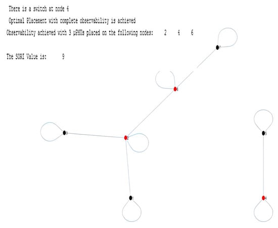 The IEEE 7-Node Network is used as a test case for various power system analysis and optimization problems. Researchers often apply algorithms, such as optimal power flow, state estimation, and observability analysis, to evaluate and validate their performance on this test network. The status of open switches in the distribution network is considered to optimize the placement of devices. Open switches represent the locations where switches are not connected, allowing the network to be reconfigured for different operational scenarios. By analyzing the status of these open switches, we can identify potential locations where PMUs can be strategically installed to enhance observability and monitoring capabilities. The simulation output can be seen in Figure 5. The algorithm runs on the assumption that the switch is still open so as not to let the change in topology influence the placement results.