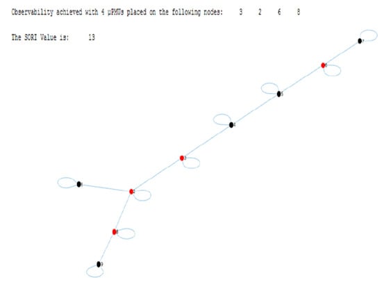 As the goal is also to find a location, which has the minimum number of unobserved nodes in the event of a device failure. So the higher the SORI value, the fewer unobserved nodes are reached in the event of a device failure. In this case, the SORI is equal to 13. And 4 PMUs are installed in nodes 2, 3, 6, and 8 (see Figure 7).