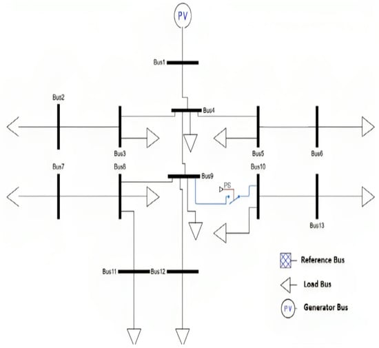 The IEEE 13-Node Network is comprised of 13 nodes and one switch. One node is a generator bus and the others are load buses (Figure 8). The IEEE 13-Node Test Feeder is a widely used benchmark system in the field of distribution system analysis and optimization. It is designed to represent a small-scale distribution network and is commonly used to evaluate the performance of various algorithms and methodologies for distribution system studies. The nodes are connected by distribution lines, forming a radial configuration. Radial distribution networks have power flowing in one direction, from the substation to the loads. The IEEE 13-Node Test Feeder is often used to evaluate various aspects of distribution systems, such as power flow, voltage regulation, fault analysis, and optimization of distributed energy resources.