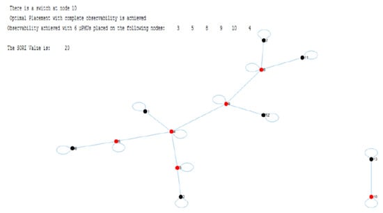 The output of the simulation can be seen in Figure 9. The algorithm reaches the observability and produces the implementation of 6 PMUs in nodes 3, 4, 5, 8, 9, and 10, with a SORI value of 20.