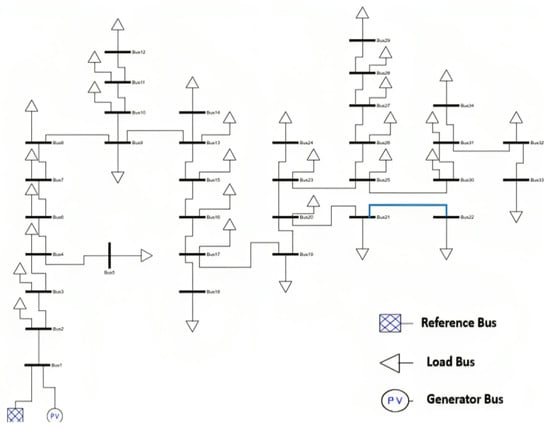 The IEEE 34-Node Network is comprised of 34 nodes and no switches. One node is a generator bus and the others are load buses (Figure 10). The IEEE 34-Node Test Feeder is another commonly used benchmark system in the field of distribution system analysis and optimization. It is designed to represent a medium-scale distribution network and provides a more complex and challenging test case compared to smaller test feeders like the IEEE 13-Node Test Feeder.