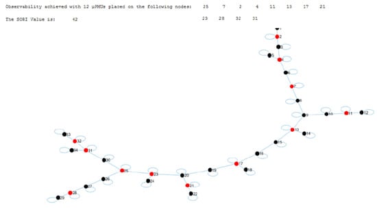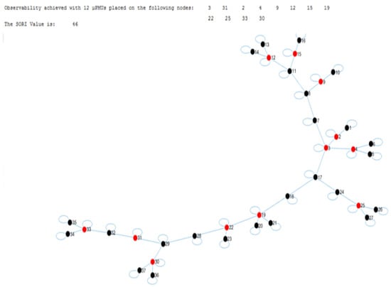 Also in this case, our algorithm takes into consideration both the status of open switches and the possibility of device failure in the distribution network to optimize the placement of devices. The algorithm accounts for the possibility of device failure in the network. Devices, including PMUs, can experience failures due to various reasons, such as equipment malfunctions or external factors. By factoring in the likelihood of device failures, the algorithm can assess the robustness and reliability of the placement strategy. Only 12 PMUs are put in nodes 25, 7, 2, 4, 11, 13, 17, 21, 23, 28, 32, and 31, with a SORI value of 42 reached. The simulation output can be seen in Figure 11.