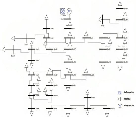 The IEEE 37-Node Network is comprised of 37 nodes and one switch. One node is a generator bus and the others are load buses (Figure 12).