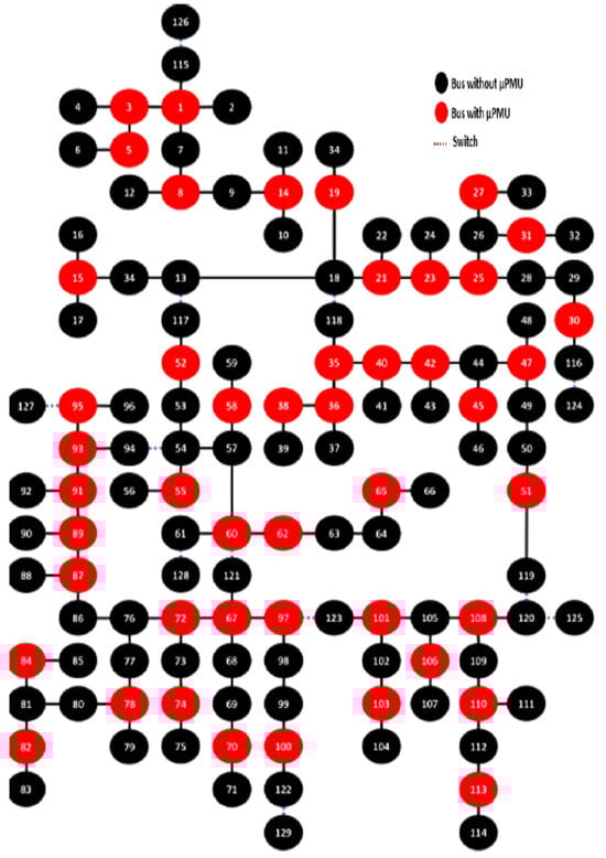 The IEEE 123-Node Network is comprised of 123 nodes. The feeder includes a variety of loads and distributed generation sources connected to different nodes. Loads represent the power consumption at various locations, while distributed generation represents power generation sources integrated into the distribution system. Its larger size and increased complexity provide a more realistic representation of modern distribution systems, enabling more comprehensive and in-depth studies. The PMU placement results can be seen in Figure 14, where 48 PMUs have been used to achieve full observability.