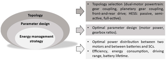 First, the topologies of dual-motor powertrain and HESS are derived based on the driving EV requirements, priorities, and trade-off between cost and performance. According to a proper topology selection, the optimal parameters of the dual-motor powertrain, including the motor power and gear ratios connected to the motors, are designed. Then, an EMS is applied in accordance with the selected topology and parameter design to minimize an objective function concerning energy loss or power consumption.