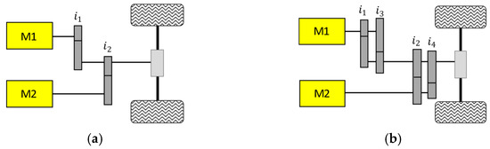 Figure 2a depicts the system configuration of a two-motor, two-speed electric drivetrain [10,11]. Two electric motors are connected to a common shaft through a gear arrangement. The maximum torque of the output shaft is calculated by the sum of the maximum torques of two electric motors (M1 and M2) multiplied by their corresponding gear ratios [12] as follows: