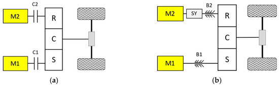 As presented in [23,24,25], the planetary gear is recognized in coaxial motor coupling. A two-gear planetary transmission couples the two motors M1 and M2 in a coaxial arrangement. Similarly, the Simpson planetary gear set powertrain is introduced by [26,27,28] and consists of two planetary gearsets (PGS). The sun gears of PGS1 and PGS2 are connected, and the carrier of PGS2 is connected to the ring gear of PGS1. The sun gear of PGS1 is where M1 is connected, and the ring gear of PGS2 is where M2 is connected. These configurations can achieve six different driving modes, including four single-motor driving modes and two dual-motor driving modes.