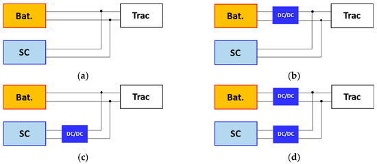Battery/SCs HESS topologies. (a) Passive topology. (b) Battery semi-active topology. (c) SC semi-active topology. (d) Fully active topology.