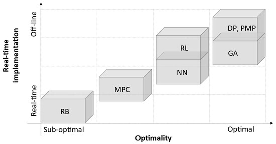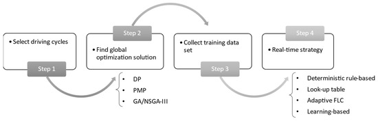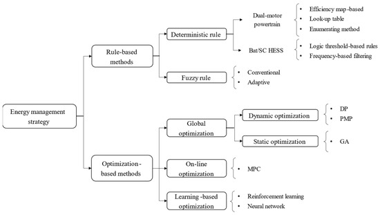 Energy management is a key component of a dual-motor powertrain coupled with a HESS. With more than two power sources, the power flow needs to be controlled to maximize the system performance, overall efficiency, and energy usage. As summarized in Figure 6, a variety of EMSs, including rule-based and optimization-based strategies, have been reviewed in various publications [3,6,7,71].