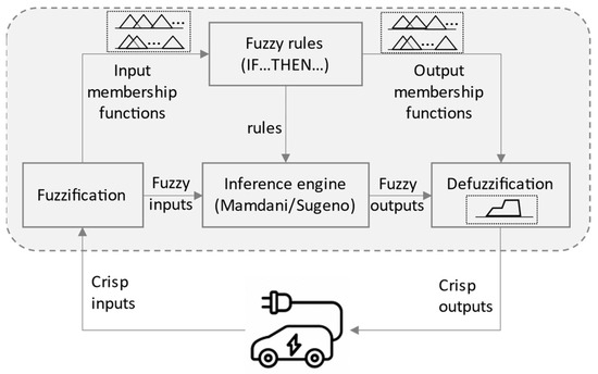 To implement a fuzzy logic control (FLC), the membership functions of input and output variables are defined in linguistic terms. Then, the if-then rules are established to demonstrate the relationship between the inputs and outputs according to the engineers’ knowledge. The basic components of a FLC include fuzzification, fuzzy rules, an inference engine, and defuzzification; as shown in Figure 7, in the control design process, a precise mathematical model of the objects is not required. In addition, the fuzzy sets and rules can be easily tuned. This provides the FLC with strong adaptability to different conditions and robustness in real-time applications.