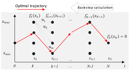 Figure 8 demonstrates the DP process with two calculation parts. In the backward part, the cost function is minimized, and the optimal control is obtained at the current stage, depending on the cost function optimized in the next stage and the final stage. Meanwhile, the forward calculation determines the optimal functions and optimal control trajectory from the starting to the end stage.