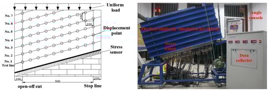 A self-angled physical similarity simulation test bench, as presented in Figure 1, has been used in the experiment to build a physical model made of similar materials with a similar ratio of 1:100. Firstly, stress sensors were evenly placed along the bottom of the test bench, and the test model was built on top of them. Secondly, the test model was set to air dry, and the corresponding displacement measuring points and the top counterweight were arranged. Finally, the test model needs to meet similar conditions of geometry, bulk density, stress, time, strength, and Poisson ratio according to the characteristics of the physical similarity simulation, as presented in Table 3.