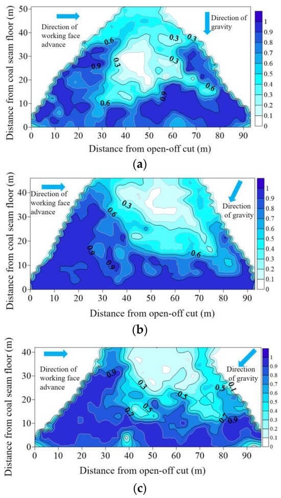Contour map of overlying rock layer in goaf under different dip angles of rock strata. (a) Contour map of overburden penetration in 0° goaf; (b) Contour map of overburden penetration in 15° goaf; (c) Contour map of overburden penetration in 30° goaf.
