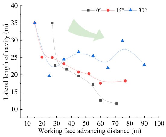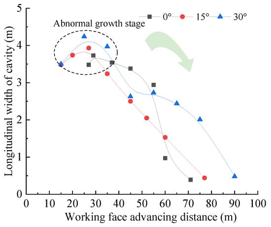 The collapse overburden of the goaf has broken expand characteristics, so the longitudinal width of the cavity was gradually reduced with the increase in advancement distance. In addition, it was numerically smaller than the mining height. However, it was found that after the formation of the cavity, the width of the cavity would be increased to a certain extent within a short period of time. More importantly, with the increased rock strata dip angle, the range increases, even exceeding the mining height, as shown in Figure 4. Influenced by the dip angle of the rock strata, the immediate roof and the main roof slipped down along the bottom plate of the rock strata to the side of the open-off cut. They were piled up in the lower goaf, resulting in a large reduction of collapsed overburden in the central goaf and an increase in the longitudinal width of the cavity. The larger the dip angle of the rock strata is, the stronger the sliding effect is, and the larger the cavity longitudinal width increases.
