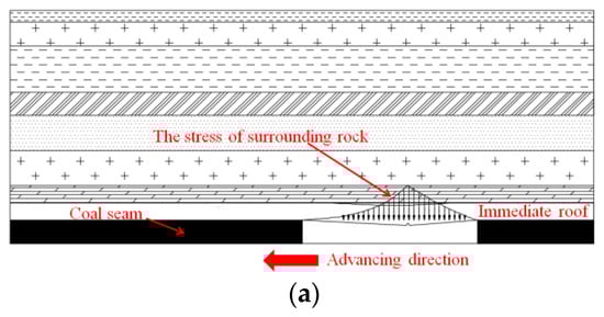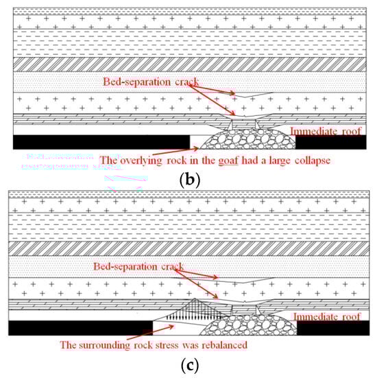 Displacement of overlying strata in goaf. (a) The stress in the surrounding rock begin to concentrate; (b) Massive collapse of overlying rock; (c) Rebalancing of stress in the surrounding rock.