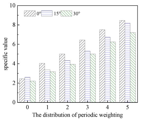 As shown in Figure 6, taking the average periodic weighting distance of 30° as the standard, the specific value of the displayed distance of each periodic weighting under different inclinations to the standard value was obtained. Obviously, the advance distances were different when the periodic weighting was displayed at different tilt angles. The average weighting of 0° was 12.5 m, which is 1.08 and 1.20 times larger than that of 15° and 30° inclinations, respectively. Moreover, it can be observed that the low-gas permeability area is formed after the large collapse in the goaf. The low-gas permeability area was more difficult than the gas migration dominant channel in terms of gas permeation and migration capacity, as it was generally formed after one or two times of periodic weighting. Therefore, it can be concluded that the larger the dip, the shorter the advance distance required for periodic weighting, and the shorter the development cycle of the low-gas permeability area provided more sufficient times for development.