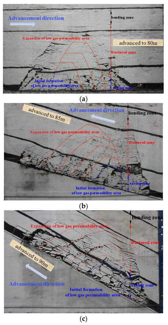 The low-gas permeability area is a local area within the fracture zone where pressure relief gas permeation and migration are significantly more difficult. The literature [23] shared the same set of physically similar simulation tests as this paper. According to the low-gas permeability area extent discrimination method in the literature, which combined the overburden separation amount, bottom plate stress distribution, and periodic pressure manifestation in the goaf, the low-gas permeability area evolution patterns under different dip angles of rock stratas were drawn as shown in Figure 7. From the analysis of the figure, it can be seen that the height of the low-gas permeability area basically coincided with the height of the fracture zone in the „three zones” of the overburden rock in the goaf. The height reached 51.1 m, 55.9 m, and 60.9 m, respectively, with the increase in the dip angle of the rock strata. Affected by the dip angle of the rock strata, the low-gas permeability area gradually shifted from the symmetrical elliptical belt form to the working face side, and its width gradually increased to 52.6 m, 60.2 m, and 65.8 m.