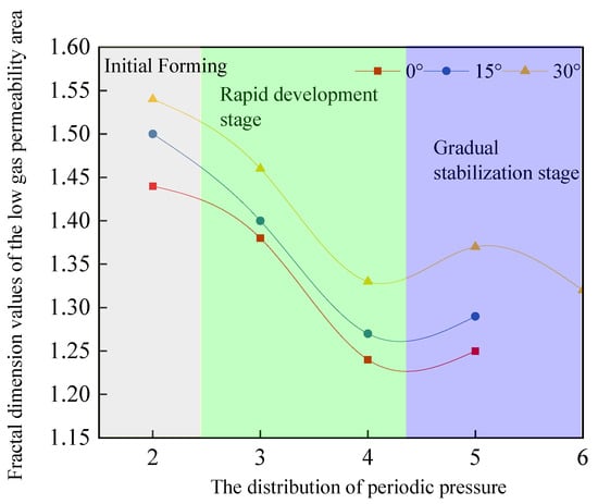 The low-gas permeability area was usually formed after 1–2 times of periodic pressure had occurred. Combined with physically similar simulation tests, the extended low-gas permeability area obtained after each period of periodic pressure was used for fractal analysis. The dynamic evolution of the dimension of the low-gas permeability area fractal with the appearance of periodic pressure was plotted as shown in Figure 8.
