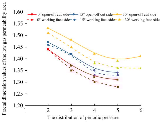 The fractal dimension of the boundaries on both sides of the low-gas permeability area gradually decreased with the appearance of successive periods of periodic pressure. In addition, on the open-off cut side, the fractal dimension of the boundaries of the low-gas permeability area was larger than that on the working face side. This was due to the fact that, as the low-gas permeability area gradually developed to a higher level with the advancement of the working face, the proportion of the caving zone in the area where the boundary on both sides was located gradually decreased. The overall complexity of the fracture decreased, resulting in a reduction of the fractal dimension. In the initial stage of overburden collapse, the larger the dip angle of the rock strata, the more obvious the influence of the sliding effect. The overburden accumulation on the side of the open-off cut was more chaotic. It increased the expansion effect of the broken rock in the initial caving zone and reduced the slip space in the later-forming area of the caving zone. This made the fractal dimension value of the low-gas permeability area on the side of the working face smaller than that on the side of the open-off cut.